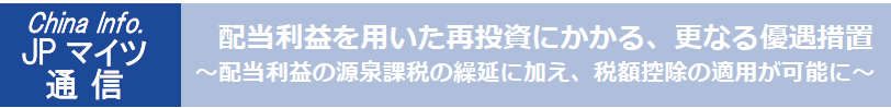 中国現地法人の配当利益を用いた再投資に関しては、以前より優遇政策があり、再投資の原資となる配当金の源泉課税(10%)が繰延されます。同政策は当初の財税「2017」88号[i]等では奨励類投資項目への直接投資に限定していましたが、財税「2018」102号[ii]以降、禁止類を除く全ての再投資項目に適用されています。