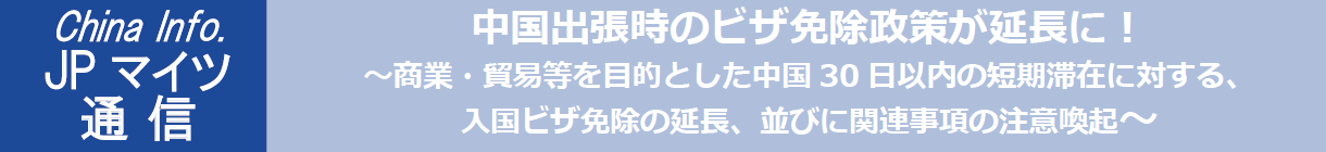 2024年11月末以降、中国出張時のビザ免除政策が採られましたが、先般、単方面査証免除措置の延長に関する通知(以下“ビザ免除措置の延長通知”と表記)[i]により、当該措置の1年延長が公表されました。